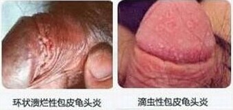 2、滴虫性龟头炎:龟头起丘疹和红斑,逐渐扩大,边缘清楚,红斑上可见针头大小的小水疱,较后形成糜烂 面。