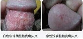 3、白色念珠菌性龟头炎、霉菌性龟头炎:包皮和龟头可见红斑,表面光滑,并有小疱疹,红斑的边缘较清楚,急性发作时有 糜烂、渗液。