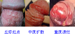 如环状糜烂性龟头炎的症状就包括龟头及包皮炎症损害呈环状,或环状有乳酪状包皮垢,日久易破溃成浅溃疡,若失去环状特征则不易与浅表性龟头炎区别;念珠菌性包皮龟头炎的症状包括龟头轻度潮红,包皮内板及龟头冠状沟处可有白色奶酪样斑片,龟头可有针头大小淡红色丘疹,包皮外及阴囊可见鳞屑性红斑。如舟状窝累及则可有尿频、尿痛等。局部可有烧灼感及瘙痒等。偶尔可发生暴发性水肿性包皮龟头炎,主要表现为阴茎包皮明显水肿、剧痒,有浅在溃疡。